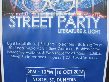 The Vogel Street Party 2015, this Saturday, October 10th, from 3pm - 10pm, will be massive. Come help us celebrate the redevelopment which is happening down in Dunedin's warehouse precinct, and Dunedin creativity in general. This year's party has a 'Light & Literature' theme, plus there'll be the usual workshops, activities, …